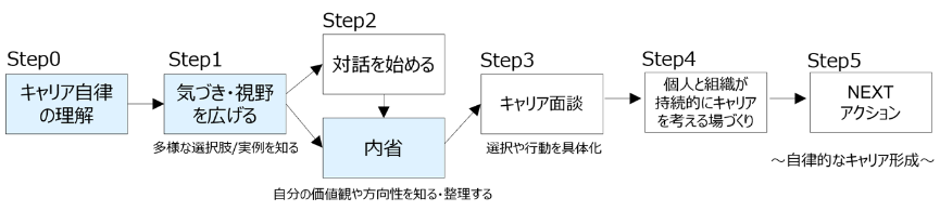 6月のキャリア月間では、「Step0:キャリア自律の理解 ⇒ Step1:気づき・視野を広げる ⇒ Step2:内省」というステップに沿って、各種情報やコンテンツを提供しました。